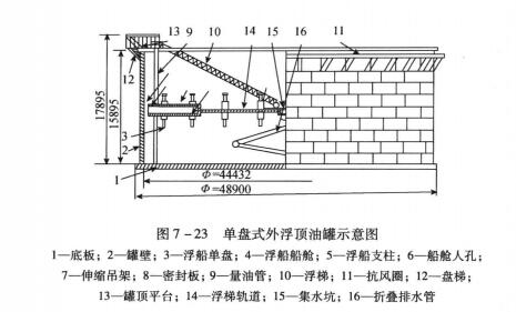 浮頂油罐浮頂?shù)纳戏绞峭耆诘摹8№斀Y(jié)構(gòu)有單盤和雙盤兩種型式。容積10000~200000m3的油罐采用單盤式浮頂。單盤式浮頂?shù)耐馊κ请p層,浮盤中心部分則是單層鋼板。雙浮盤頂為上下兩層的圓形浮艙。所以浮艙,不論是單盤或雙盤,都要用徑向隔板分成若干個互不連通的隔艙,以防個別隔艙滲漏造成浮頂下沉。圖7-23為單盤式外浮頂油罐示意圖。浮頂下面有許多支柱,當液面下降到距罐底一定高度時,支柱將浮盤支撐柱,不使浮盤落到罐底上,以利于對浮盤和罐底進行檢修。一般支柱高度為1800mm。浮盤中心稍呈凹形,向中心坡度一般不小于15%。下雨時,浮頂上積聚的雨水便于匯集到浮頂中間,通過 浮頂下面的可隨浮頂升降和伸縮的排水折管排至罐外。而底板的坡度則是為了使油面上的油氣匯集于單盤邊沿,以利從透氣閥排出。另外,油罐頂部裝有防風圈和加強圈,以增強罐壁強度,油罐上壁的頂端還有供操作人員走向灌頂?shù)幕顒臃鎏?。浮頂升降時,扶梯能沿罐頂上的專設(shè)扶梯導致滑動。