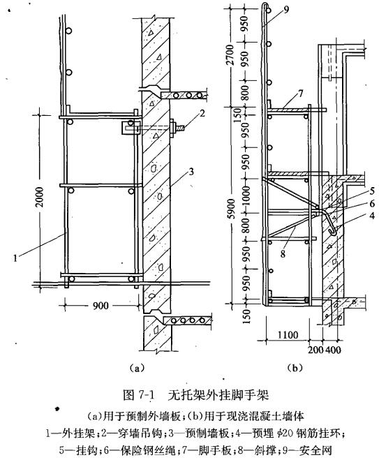 無托架外掛腳手架有兩種形式,一種形式是在每層預(yù)制外墻板或現(xiàn)澆外墻上預(yù)留孔洞,用帶掛鉤的螺栓將掛鉤固定在墻體上,當下一層結(jié)構(gòu)施工完后,可用塔吊將架子掛在固定于墻體上的掛鉤上,如圖7-1(a)所示,以便于進行上一層作業(yè);另一種形式是在四周現(xiàn)澆柱子外側(cè)每層預(yù)埋一個直徑20mm的鋼筋環(huán),角柱則預(yù)埋兩個鋼筋環(huán),外掛架子用塔吊提升后用鋼絲繩及卡環(huán)與預(yù)埋鋼筋環(huán)連接,如圖7-1(b)所示